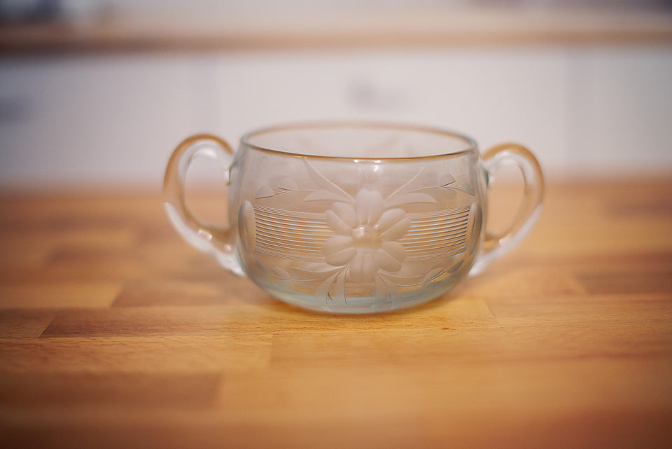 This rare etched glass vessel features a gold-rimmed edge, delicate floral design, and two graceful handles. Slightly larger than our standard small size, it’s perfect for anyone who loves a little extra luxury.