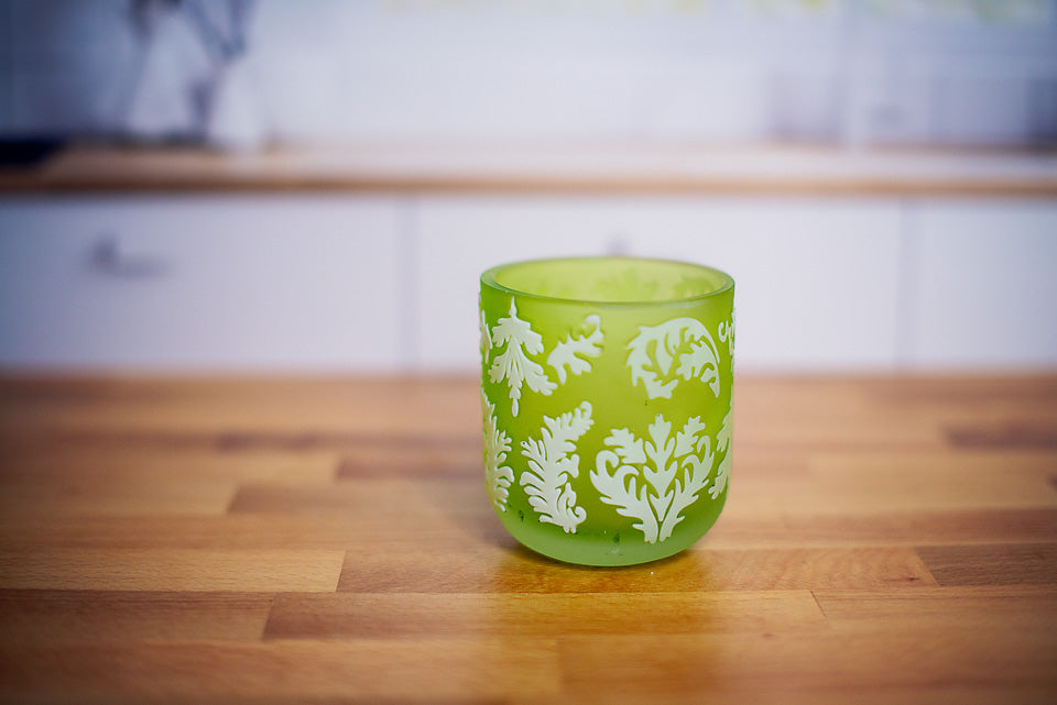 This charming green frosted glass candle features a crisp white leaf design, perfect for adding a pop of color to any space. Hand-poured with our all-natural soy wax in your choice of scent.