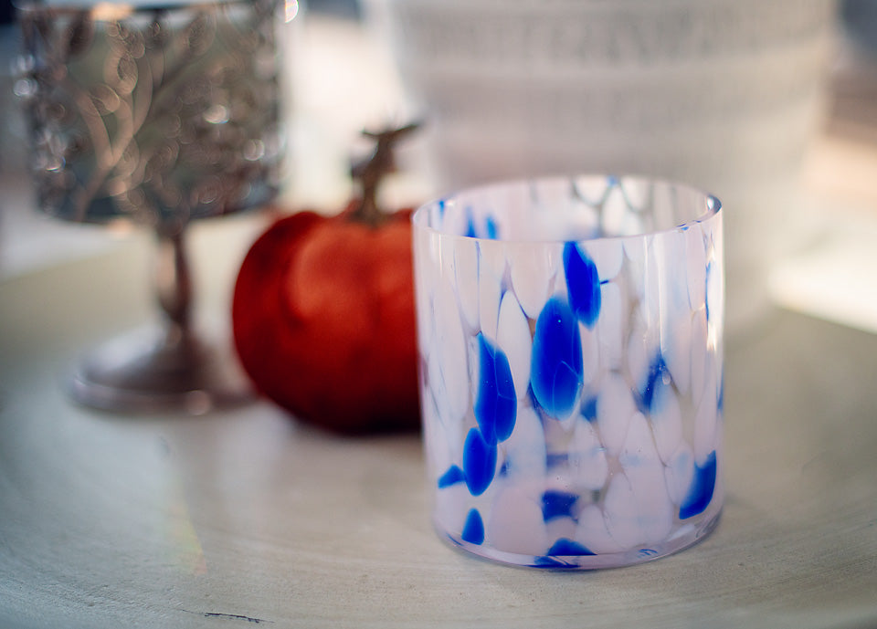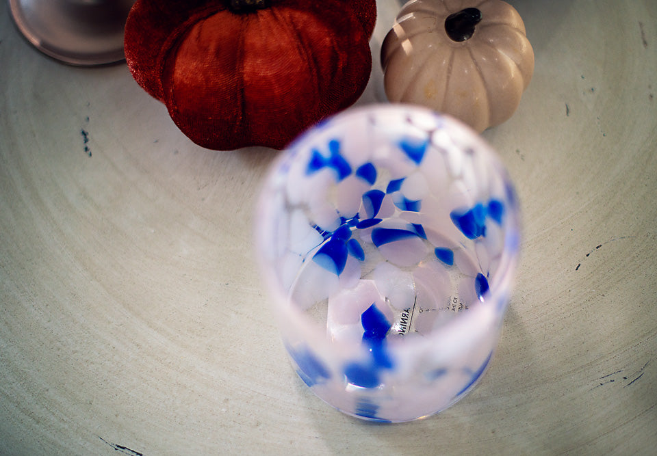 A true work of art. This hand-blown glass vessel features a stunning swirl of cobalt blue and milky white, creating a stained-glass effect that glows beautifully when lit. Each piece is unique in its pattern and shape, making it a one-of-a-kind statement candle.