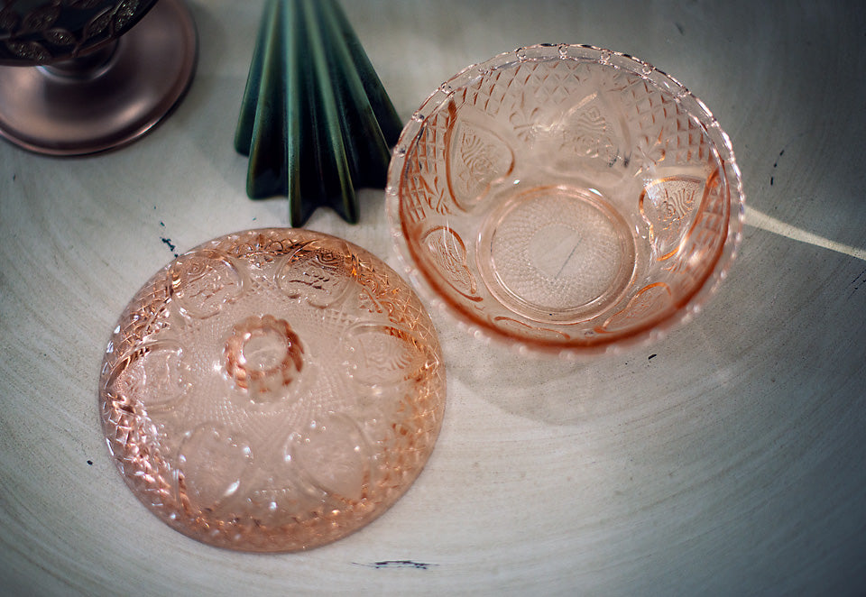 A true vintage treasure — this Pasari Indonesia Pressed Hearts Bowl features intricate heart and floral detailing in romantic blush pink glass, complete with a matching lid. Each pattern catches the light beautifully, making it a timeless statement piece.